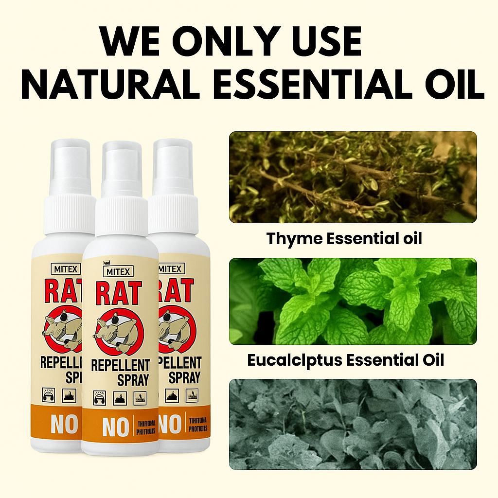 MITEX Rat Repellent Spray uses 100% natural essential oils like Thyme and Eucalyptus to keep rats away safely and effectively.